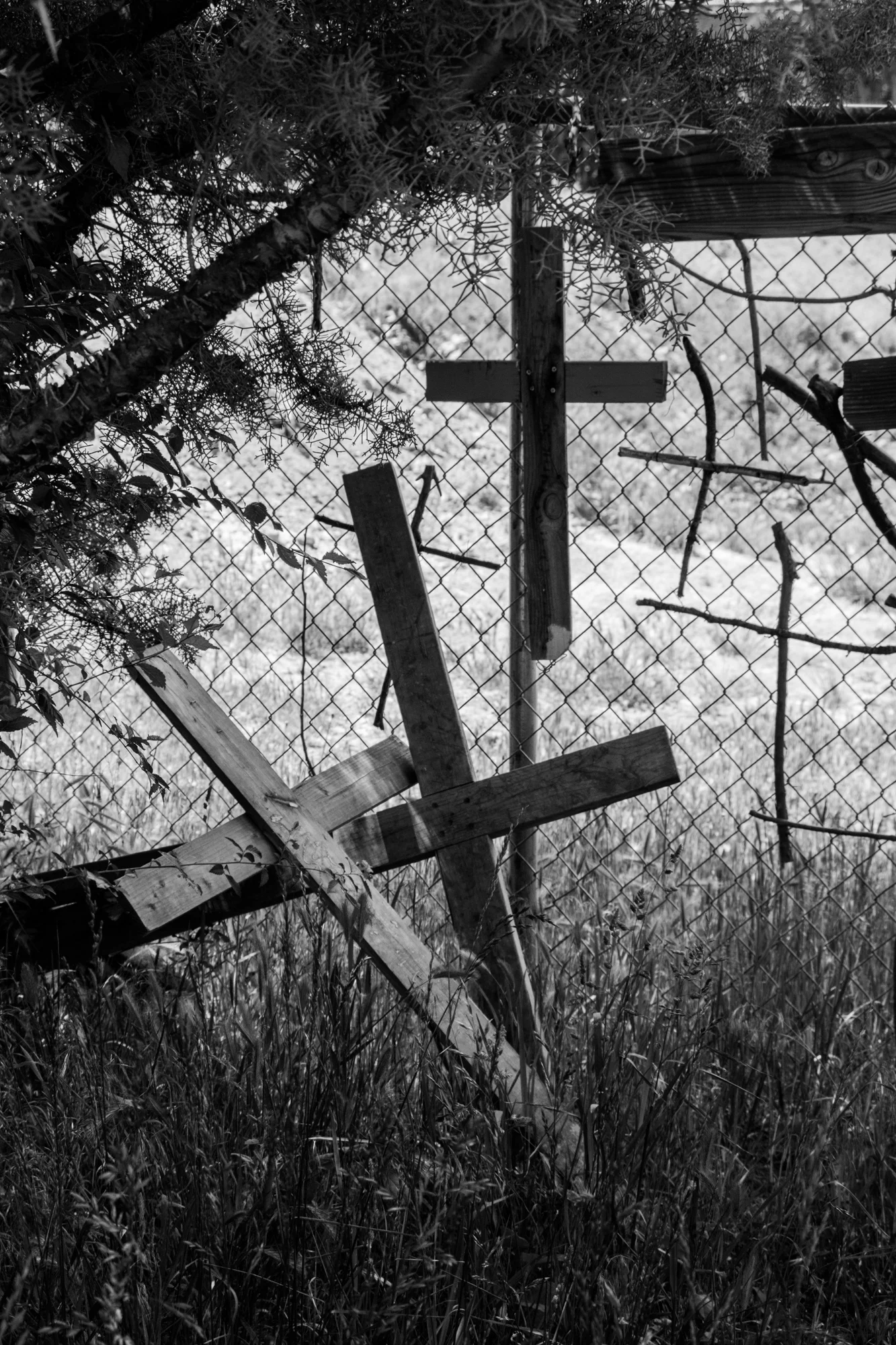 Pilgrims, petitioners, the pious arrived before us. The wooden crosses they carried, sometimes barefoot, sometimes hundreds of miles across New Mexico, litter the path from parking lot. Others have transformed the chain link fence leading up to the sanctuary, attaching their offerings. Artfully crafted crosses tied next to homely ones, pictures of loved ones, even a tattered necktie are now prayers. Nearby cottonwoods are draped with rosaries and small crosses. At the edge of the plaza a stone altar overflows with more rosaries, hundreds of rosaries, and dozens of votive candles.