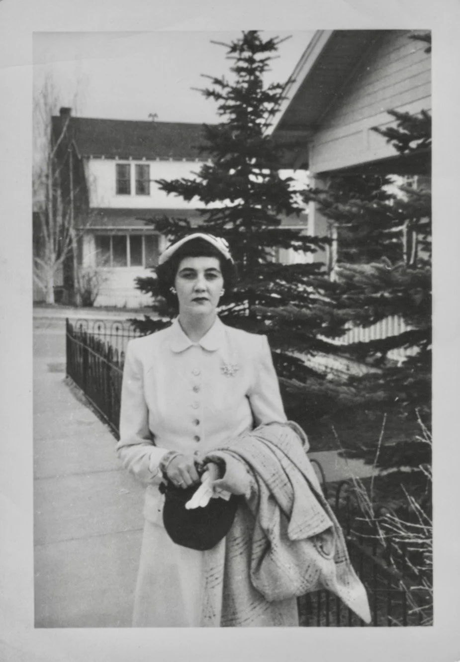 As the Butte Daily Post reported, "Given in marriage by her father, the bride wore a stunning gabardine suit in sun gold with accessories in acorn. Her corsage was of yellow roses." She is not smiling in her photo in front of her parent's home that day. She was not unhappy, she simply never smiled in photographs..